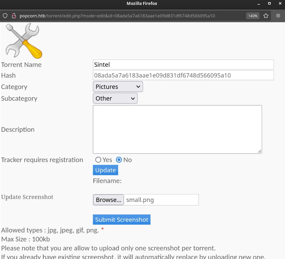We register a new user and login. We can upload a torrent file to the server. We find out, that we can add some screenshots to the torrent file. Let’s try to upload a PHP reverse shell as a screenshot.